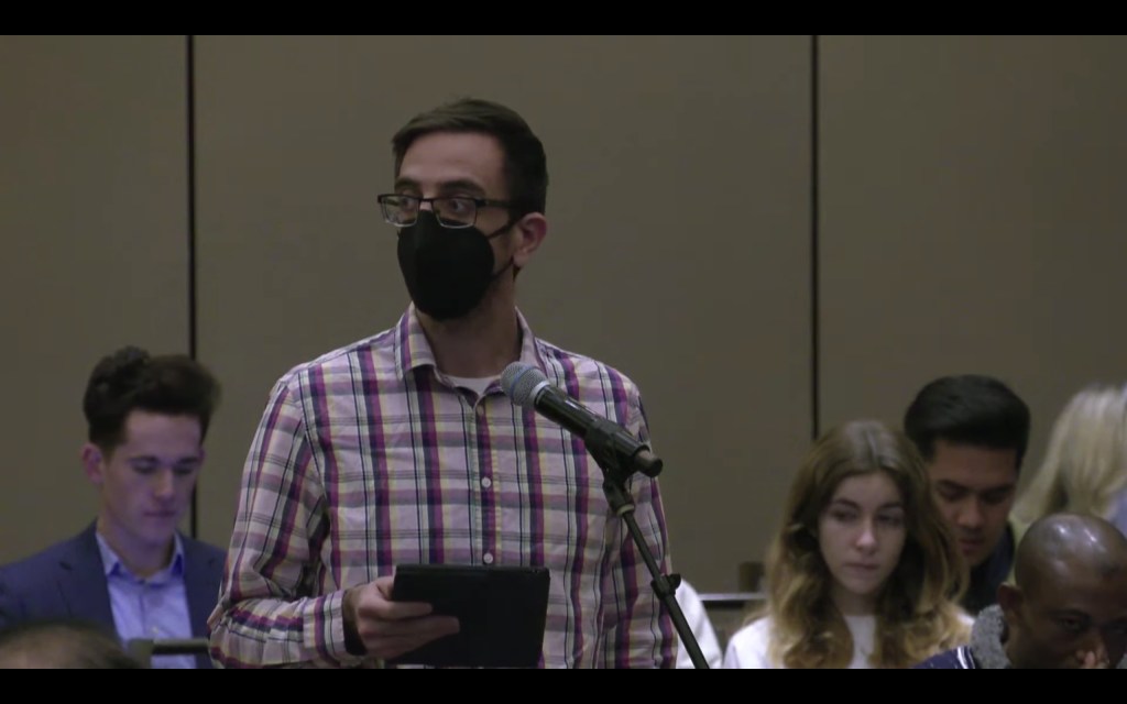 My name is Justin Freebourn. I’m a doctoral candidate in political science at UC Riverside. I’m speaking today on behalf of my teaching assistants who are immunocompromised people with children too young to be vaccinated. We would like the Regents to extend the compassionate allowing for remote work for those living with at risk people. Now, no one should have to live and work in fear that they may be the bringer of a disease that kills or harms their friends or family. I believe that restoration of the compassionate clause and remote work is key to maintaining the UC as an accessible workplace. We must realize the gains of creativity and psychological safety. Science needs diversity of perspectives to flourish, and that diversity must include us. Thank you for your time.