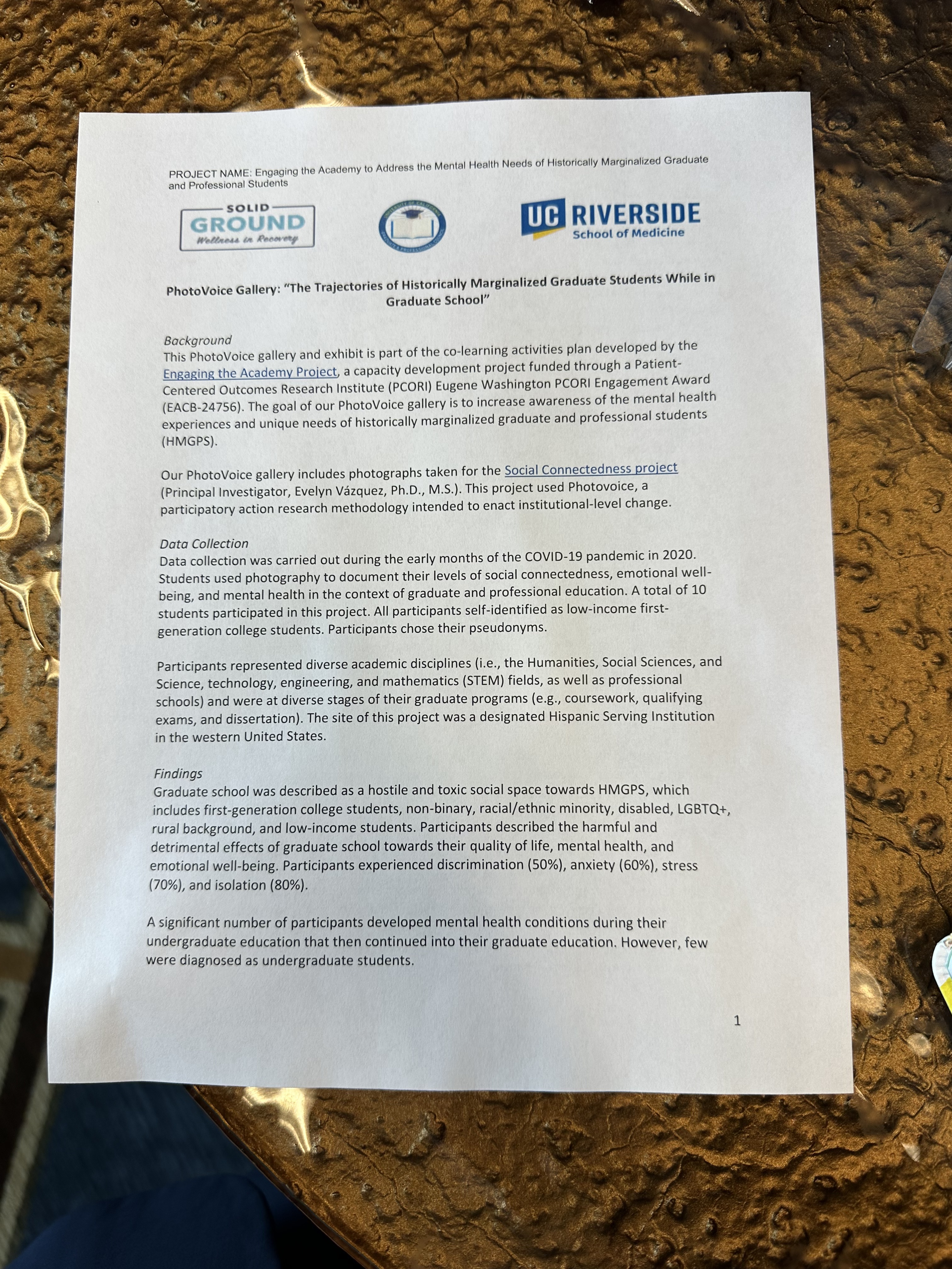 Dr. Evelyn Vazquez’s fascinating exhibition at the UC Board of Regents meeting is a significant milestone in the collaboration between the UC Graduate and Professional Council (UCGPC) and the Engaging the Academy’s Taskforce. The exhibition “The Trajectories of Underrepresented Graduate Students While in Graduate School” is a powerful testament to UCGPC’s commitment to prioritizing student mental health. This gallery results from a year-long collaborative effort between UCGPC and the task force, reflecting their shared dedication to addressing the unique mental health challenges historically marginalized graduate and professional students face. It showcases the profound impact that can be achieved when organizations like UCGPC and passionate scholars like Dr. Vazquez join forces to bring attention to vital issues and work toward meaningful change. The exhibition is an excellent example of UCGPC’s annual priority, demonstrating its unwavering commitment to fostering a supportive and inclusive environment for all graduate students within the UC system.