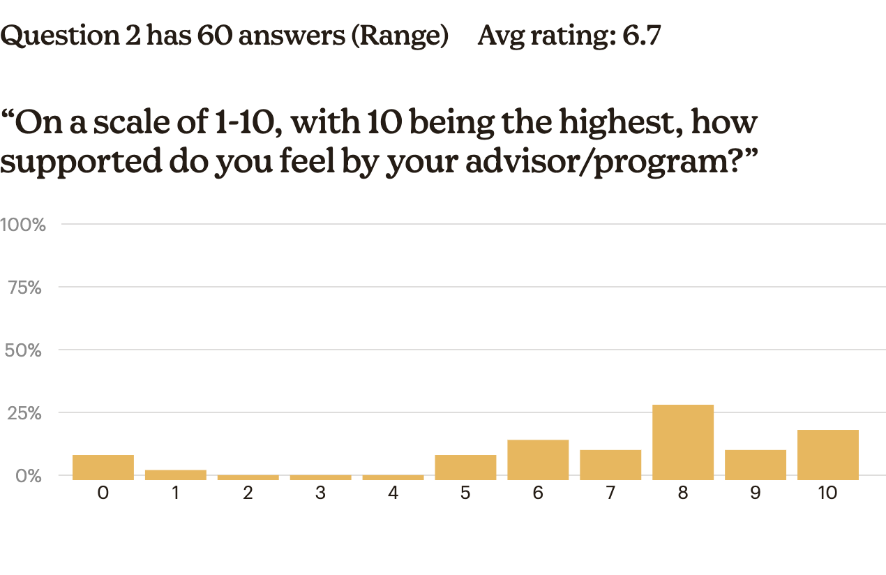 Out of 60 respondents, a small sample largely representing STEM graduate students in Davis, they rated their current advisor mentorship at 6.7 out of 10. Thirty-nine of the respondents were in doctoral programs in STEM fields.