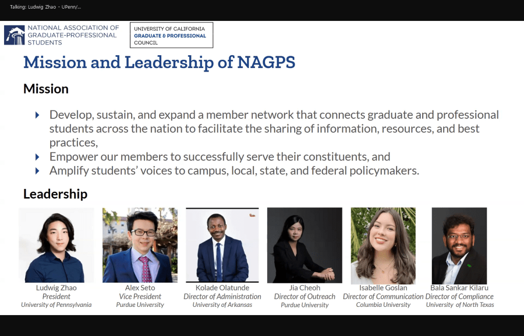 The meeting began with introductions from the hosts. Ludwig Zhao from UPenn/NAGPS introduced himself as the NAGPS president and mentioned the co-hosts. Ryan Manriquez from UC Berkeley introduced himself as the UC Graduate and Professional Council president. Pat Ordonez-Kim introduced herself as the Executive Director of UCGPC, representing graduate professional students across the University of California.