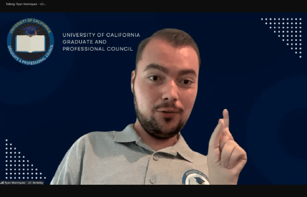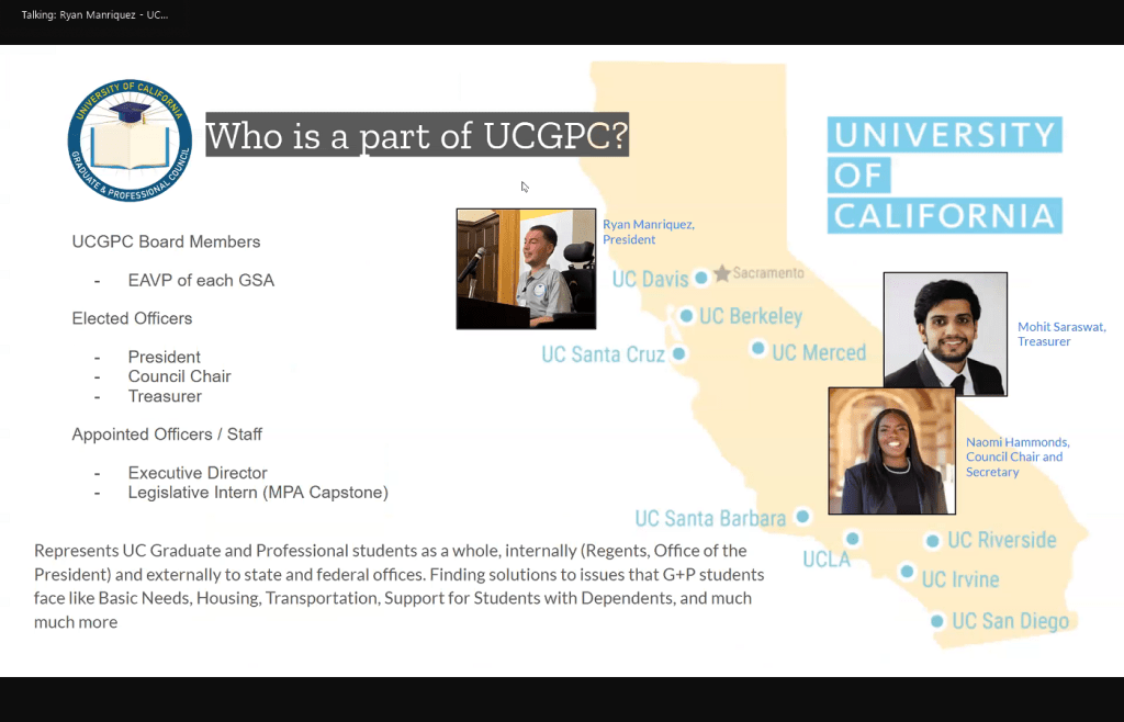 Ludwig mentioned the reaffirmation of commitment to graduate students and the upcoming National Graduate Professional Students Appreciation Week. Ryan Manriquez shared a letter addressing transphobia, Islamophobia, and other attacks on student communities. He also mentioned remarks made at the UC Board of Regents meeting on NIH funding and supporting international and undocumented student communities.